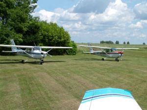 I had PPR’d all the stops several days previously so we were all ready to go. The first stop was nice and easy, Fowlmere, just west of Duxford. Not very far and not really a farm strip as such but a good one to start with having a decent 700 mtr grass runway. With a quick bit of planning we were away into the rapidly clearing skies and up through the Luton Stansted gap. Fowlmere’s well mown runway was easy to spot amongst the much longer surrounding crops and after a quick courtesy call to Duxford info we were soon positioning to join downwind RH for 25, being careful to avoid the bird sanctuary close to the downwind leg. All was quiet at Fowlmere and we gave blind calls only. With all in and shut down on the very decent parking area we left our landing donations in the box and took advantage of a vending machine coffee before the next stop was revealed. Fowlmere dispite being a quick trip tends to be overlooked flying from NW but it is a very well kept airfield and although not offering much in the way of facilities has a very nice feel about it.