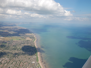 With one plane down, it was on and upwards with all planes taking off in the last 5 minutes of their 30 minute flight plan slot. Kieran was soon overtaken by the larger 172’s even though he was taking the most direct route using the QE2 bridge as a reference. We then all headed to the east of the Gatwick Zone picking up the MAY VOR. Clouds and airspace had kept us fairly low, but as we turned to the west, we put a courtesy call into Shoreham passing them to the north and made our way to Bognor Regis and the coast while managing to gain some height as the clouds started to separate.