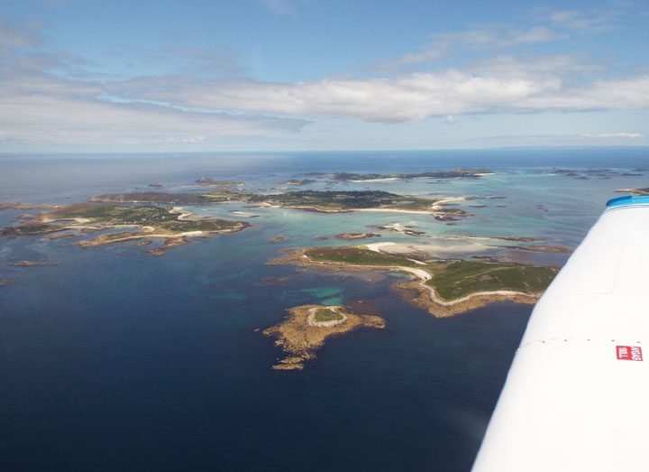 Climbing out from R12 in a right turn gave us a great view of Culdrose and the surrounding countryside and coastline. On reaching 2300ft we could already see the outline of the Scilly Islands on the horizon in the stunningly clear air. Routing past St Michaels Mount we said goodbye to Culdrose radar and changed to Lands End for the initial crossing being told to report at 10 miles from St Marys. The air was clear and smooth, the sea unbelievably calm and the views just stunning, what more could we want on a fly out.