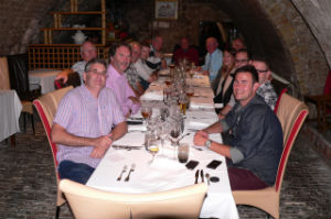The afternoon was taking up with visiting the town itself which is dominated by the impressive Notre Dame Cathedral and the town square. After a bit of wandering it was the usual group ‘beer time’ and a leisurely hour was spent in a pavement cafe in the surprising warmth people watching in the square. Jonathan S and Stewart B had done a grand job of a local recce and found a restaurant for dinner. A little later the we regrouped and headed for the Restaurant du Cygne where we were ushered into a cellar below the main restaurant where a long table had been prepared. This had echos of our stop at Perigueux on the way to Asturias in 2011 and the food was just as good, well almost. Waddling back to our hotel it was an excellent end to a very good day.